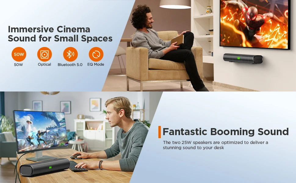 Саундбар имеет встроенную технологию DSP для точного захвата звука. С 3 различными режимами звука (общие/голосовые/высокие), подходящими для различных сценариев использования. Играете ли вы в игры или смотрите фильм, вы можете выбрать один режим эквалайзера, чтобы улучшить свой опыт.