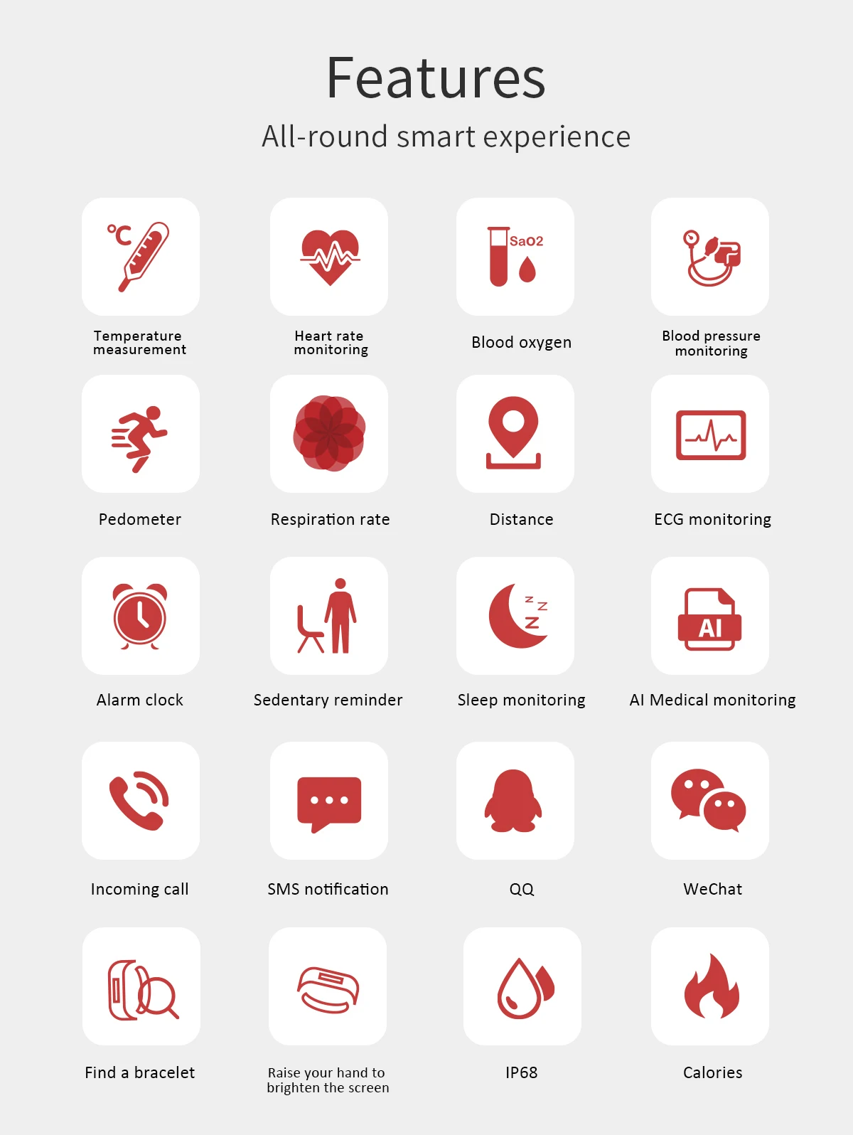 Функция электрокардиограммы, медицинская диагностика AI, мониторинг температуры, мониторинг оксигемоглобина, частота дыхания. Функция упражнений: количество шагов/калорий/расстояние, несколько режимов движения. Мониторинг сердечного ритма, мониторинг артериального давления и другие функции здравоохранения удаленные функции по уходу за близкими и друзьями
