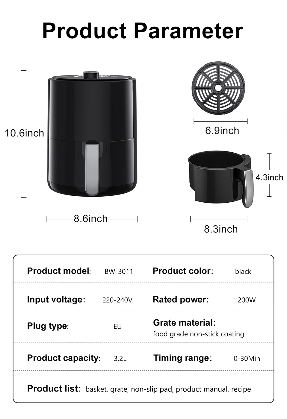 Воздушная фритюрница без масла покрыта пищевым материалом, который не содержит вредных веществ, таких как PFOA. Антипригарная корзина не содержит ожогов и легко моется.