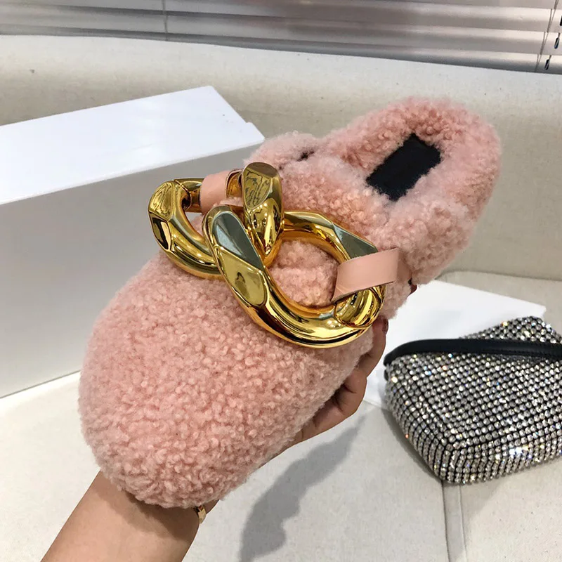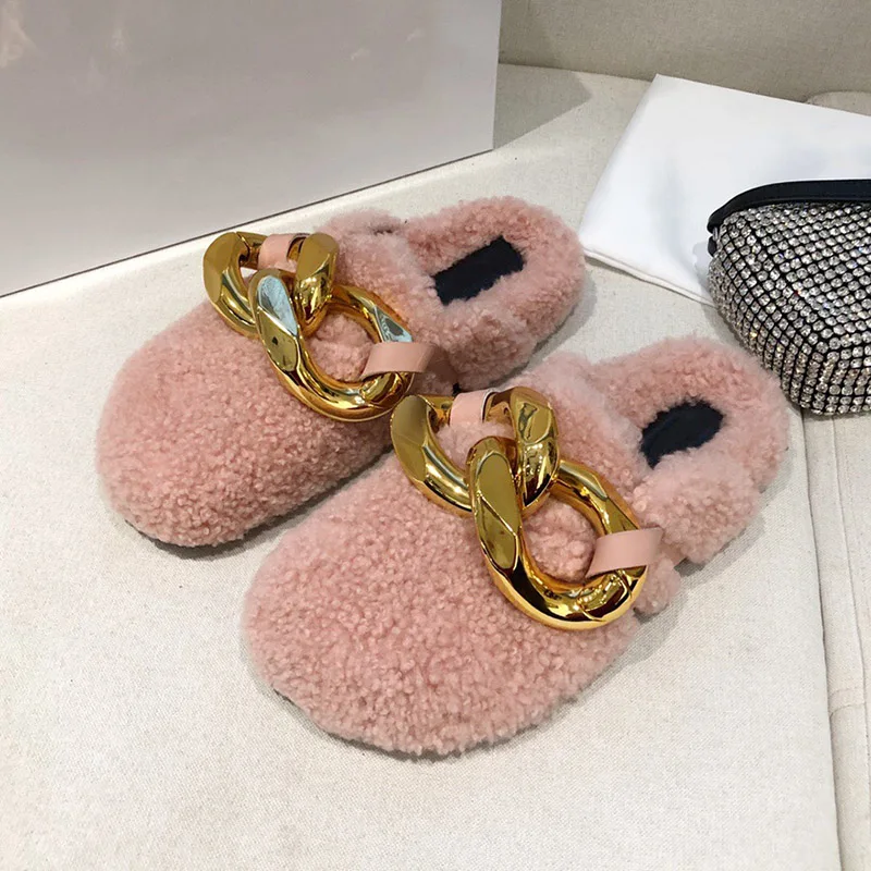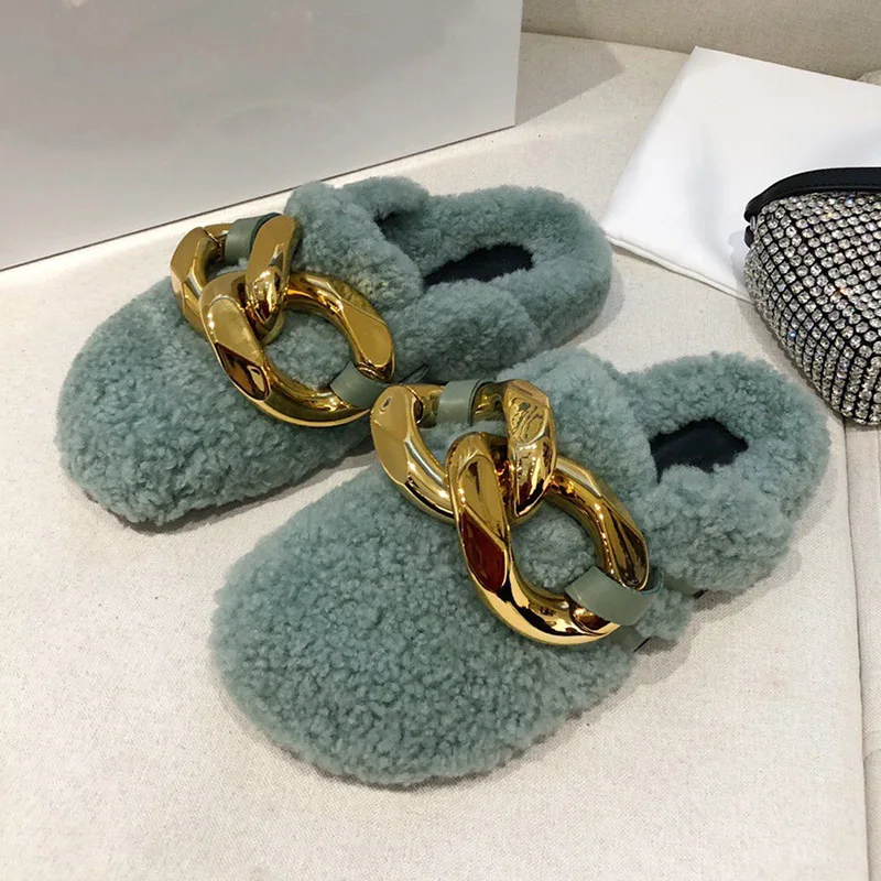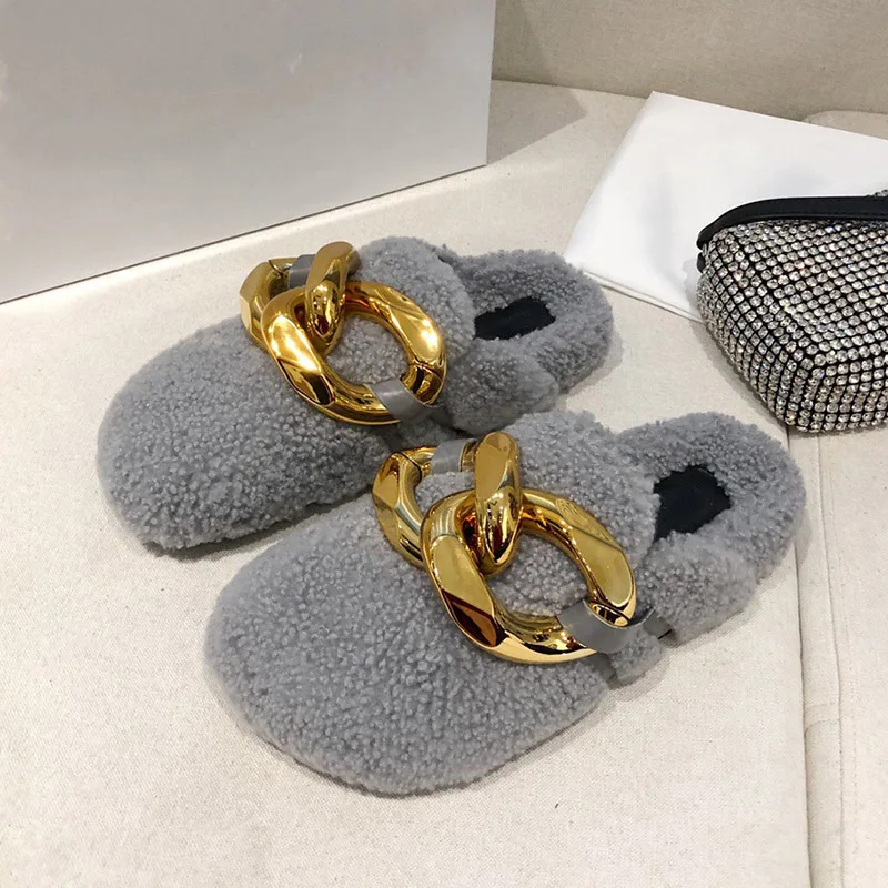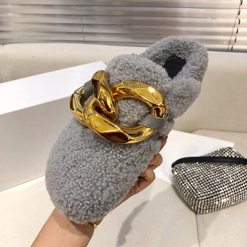 2021 г., зимние женские тапочки обувь на плоской подошве с золотым металлическим украшением модные удобные домашние теплые тапочки из натуральной шерсти
