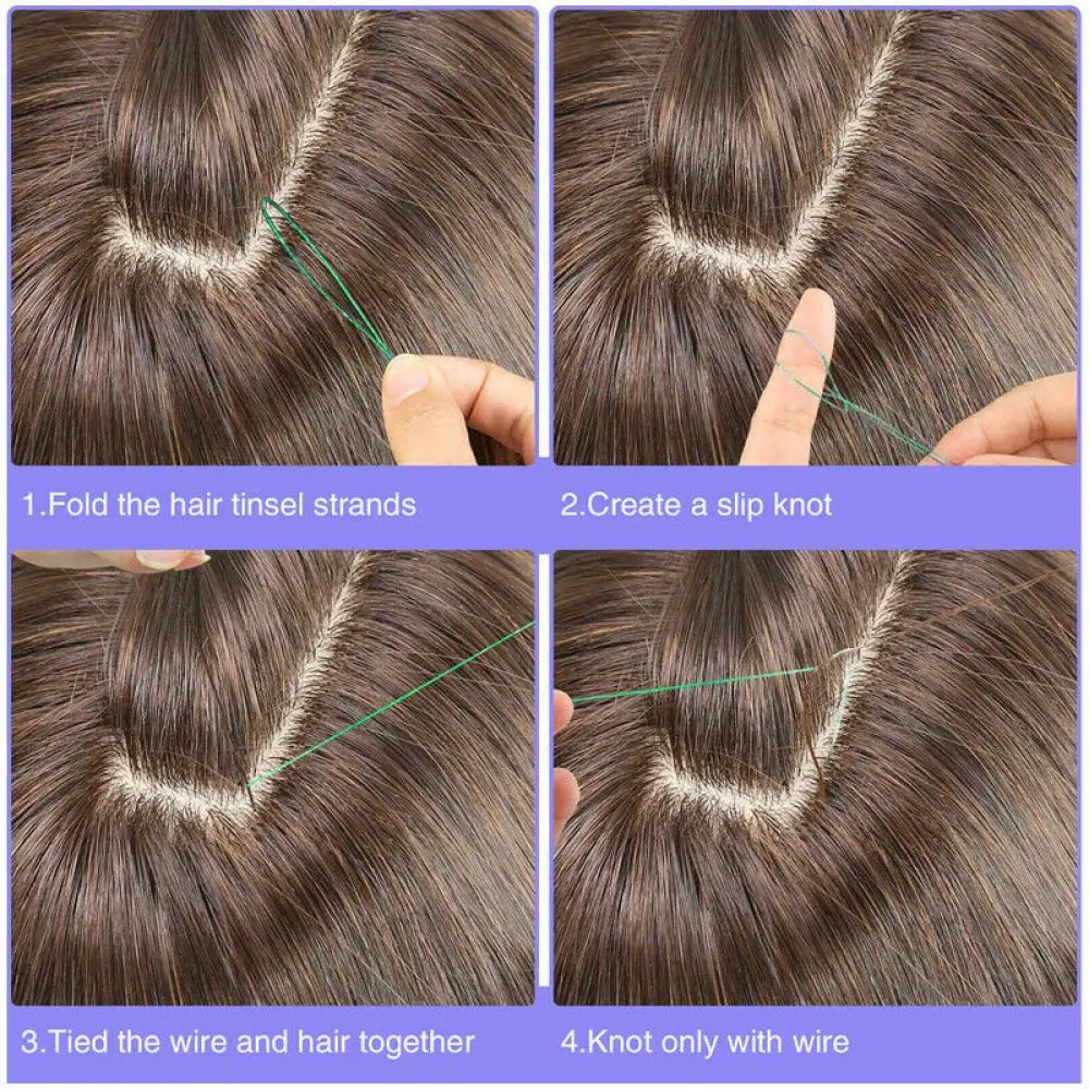 Для тонких волос, выберите 3 или 4 пряди волос (1 или 2 пряди для более густых волос), сдвиньте кольцо на волосы, потяните мишень, чтобы узел был близок к валу волос, сделайте волосы и мишень узлом. Как только он крепится к нижней части волоса, затяните его. Теперь вы можете сбросить волосы и вытянуть концы мишуры в противоположном направлении, пока узел не станет твердым.