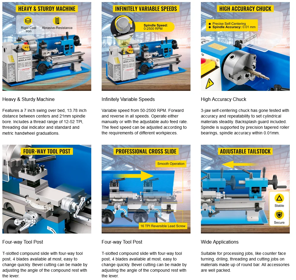 【Профессиональное соединение REST】-мини-металлический токарный станок быстрого изменения инструмент пост может достичь положения внутренней резки, резки лица и конической резки путем изменения угла инструмента и регулировки сложного отдыха. Профессиональная перекрестная горка спроектирована с абразивной устойчивостью, перемещающиеся лезвия свободно с кормовым стержнем.