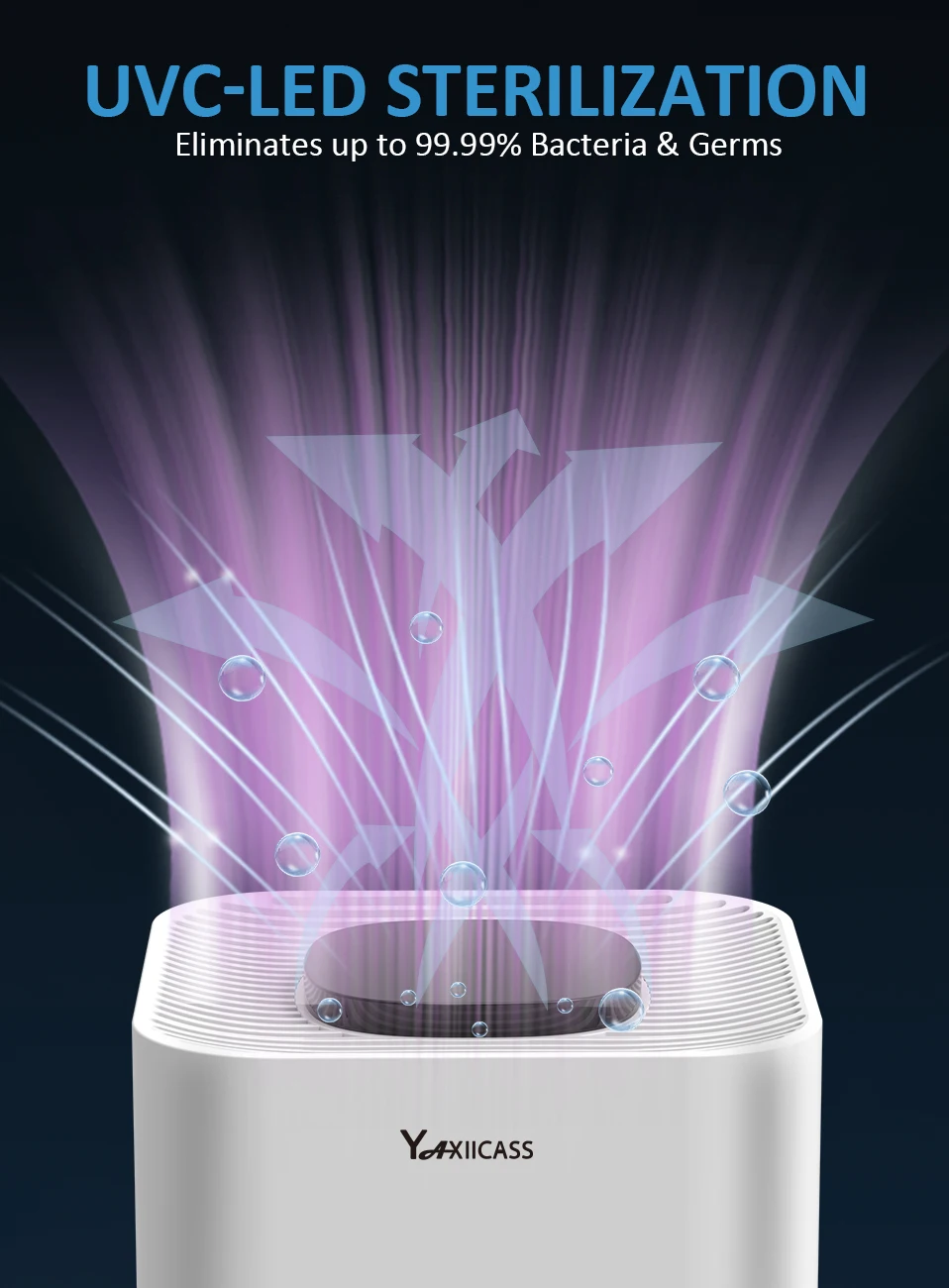 YAXIICASS air purifier for home comes with UVC LED sterilization function. Breaks the internal structure of harmful airborne substances effectively to prevent it from multiplying, without secondary pollution.