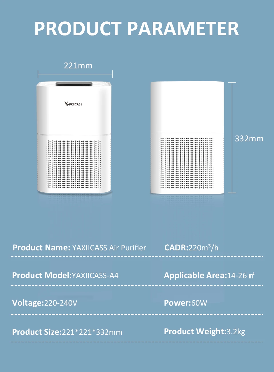 With YAXIICASS air purifier, you are free from any worry related to airborne pollutants such as bacteria, PM2.5, second hand smoke, allergen, pet dander, formaldehyde, odor, etc. The filtration capacity is as high as 220m³/h, suitable for different places of 14-26㎡, keeping a clean and healthy environment.