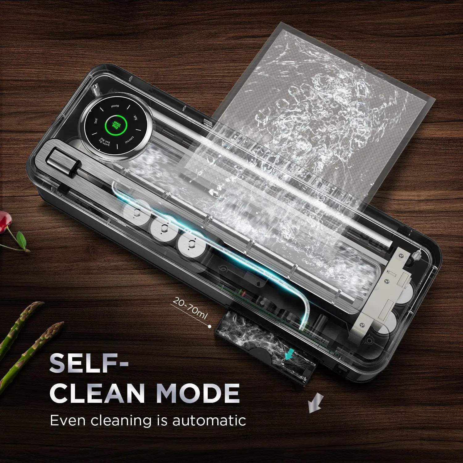 Эксклюзивный режим самоочистки автоматически помогает устранить запах и влагу внутри уплотнителя одним касанием. Компактный дизайн с корпусом из нержавеющей стали, легко чистить и хранить.