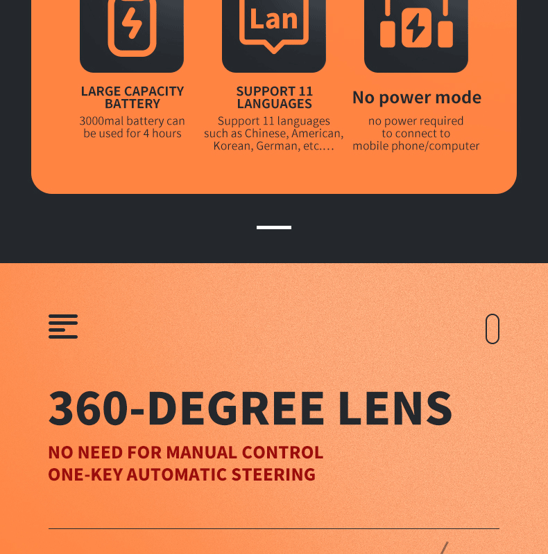 3. Датчик: высококачественный CMOS-датчик. Разрешение: 1280*720 пикселей. Угол обзора оптического объектива: 60 °. Источник питания: через порт USB для смартфонов Android