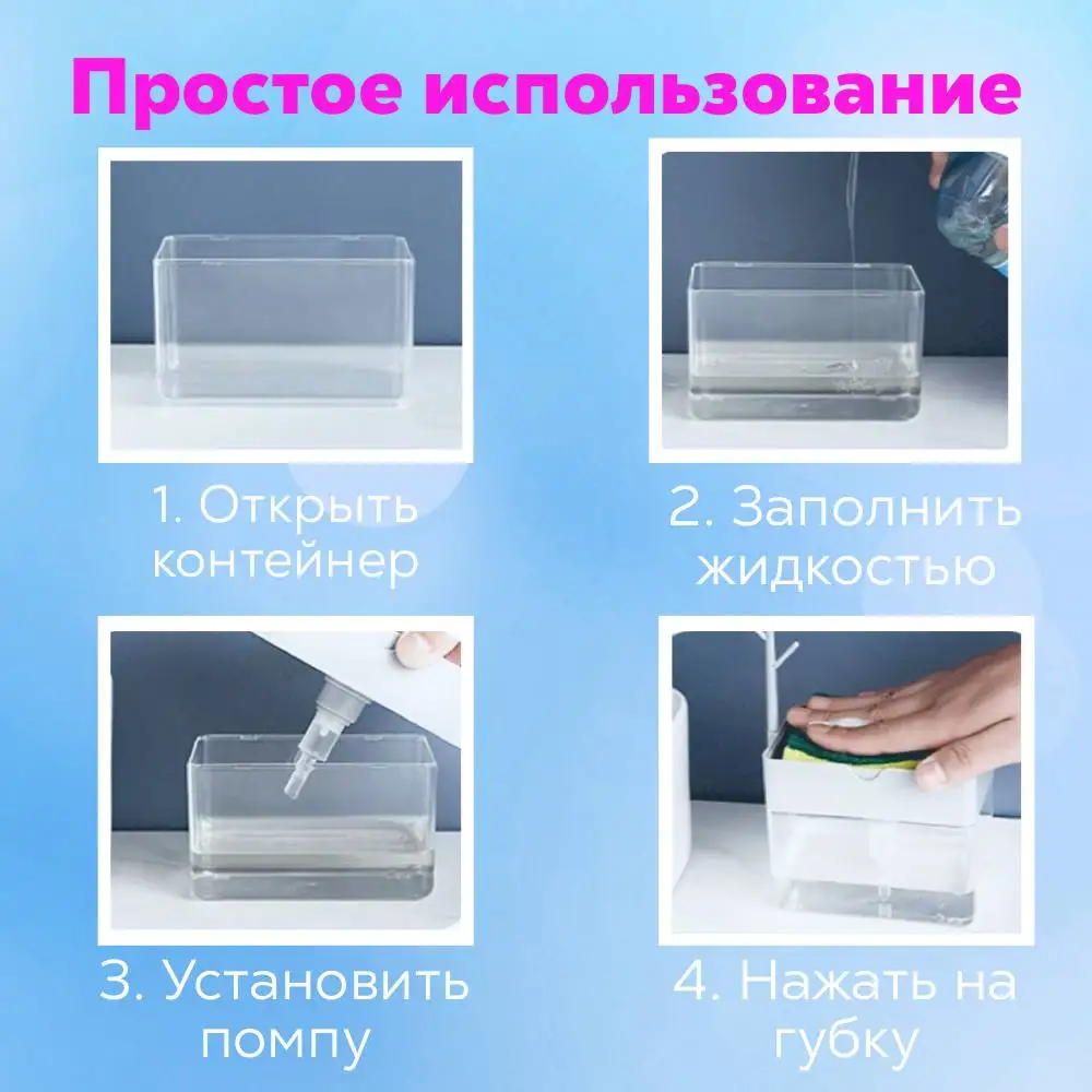 Instruction on using liquid soap dispenser with sponge: 1. Open the dispenser, 2. Fill the dispenser with detergent, 3. Close the dispenser with a lid and a pad under the sponge, 4. Wet the sponge, 5. Press on the dispenser with a damp sponge. The sponge is enough and evenly impregnated with detergent. At the same time, the consumption will be very economical.
