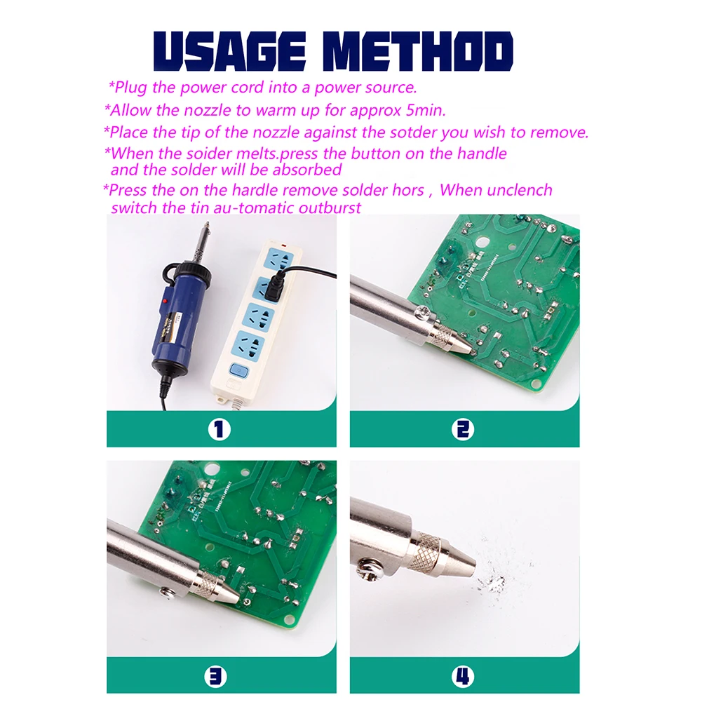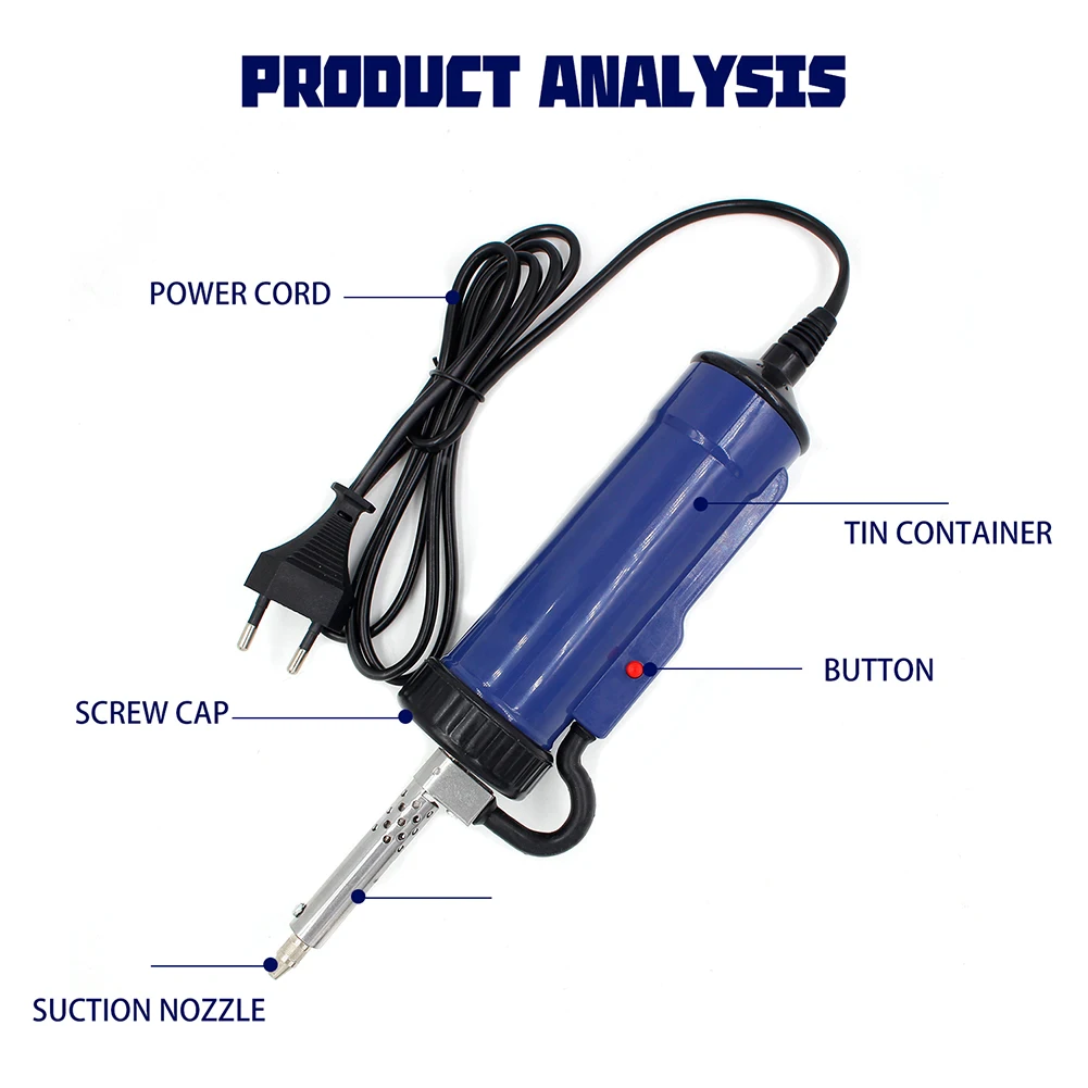 Машина для распайки портативного паяльника, сварочные инструменты, автоматический Электрический припой, Оловянная присоска, вакуумная пайка, насос для удаления с 3 всасывающими насадкамиХарактеристика: Этот продукт является специальным паяльным съемным инструментом для электронной и электрической промышленности, независимо от размера паяльного соединения или двусторонней печатной платы, он может достичь эффекта удаления. Устройство всасывания олова принимает новую структуру, и его телескопическая резиновая трубка прикрепляется к одной стороне, чтобы создать закрытую воздушную камеру, которая может поддерживать хорошую герметичность при длительных рабочих условиях, И полностью решить проблему, что традиционные инструменты не герметичны. Среди них, когда используется Электромагнитная мощность, при работе всасывания, нужно только нажать переключатель, чтобы удалить расплавленный Олово из паяных соединений. Он имеет характеристики удобной работы, чистые Паяные соединения, высокую эффективность работы и длительный срок службы. Он может быть широко использован во многих областях, таких как национальная оборона, связь, компьютеры, научно-исследовательские единицы, производители электроники и электроприборов, персонал по обслуживанию электроприборов и энтузиастов электроники. Мощное всасывание, Быстрое нагревание, быстрое и эффективное и сменные насадки, идеально подходят для разгрузочных работ. С помощью вакуумного насоса соленоидного клапана, он может быстро поглощать олово и выведение, и широко используется в областях технического обслуживания, таких как электронные приборы. Он подходит для удаления олова/плавления олова для толстой пленки и больших компонентных интегральных схем, а также для электрических и нагревательных целей. Поддержка самостоятельного использования вручную, используется для длительного использования после включения. Операция простая, быстрая и удобная, что помогает повысить эффективность работы. Металлический сплав T-ip, избегайте окисления, длительный срок службы. Корпус из нержавеющей стали со встроенным тонким прочным нагревательным элементом, очень практичный. Спецификация: Наименование: машина для распайки Цвет: синий Материал: сплав + изоляционный Высокотемпературный Пластик Рабочее напряжение: 220 В Вилка: ЕС Мощность нагрева: 30 Вт Электромагнитная мощность: 350 Вт (Мгновенная) Класс изоляции: Класс e Как это работает: непрерывный Использование и чистка продукта Инструкции: Включите питание и подогрейте в течение 3-5 минут перед использованием. Выровняйте наконечник сопла с паяльным соединением, которое будет удалено, и расплавьте припой. Нажмите и удерживайте кнопку всасывания олова, чтобы всасывать припой в резервуар для хранения олова. Извлеките устройство всасывания олова из припоя, отпустите кнопку всасывания олова для распыления оловянного шлака. Очистка и замена: Примечание: для очистки и замены деталей, мощность должна быть выключена, и оборудование может быть полностью охлаждено, прежде чем продолжить. Очистка шлака олова: Сначала удалите накопленные оловянные капли Затем очистите оловянный шлак в шланге Поверните крышку против часовой стрелки Вылейте оловянный шлак в шланг Примечание: В связи с различиями мониторов и эффектами освещения реальный цвет тов
