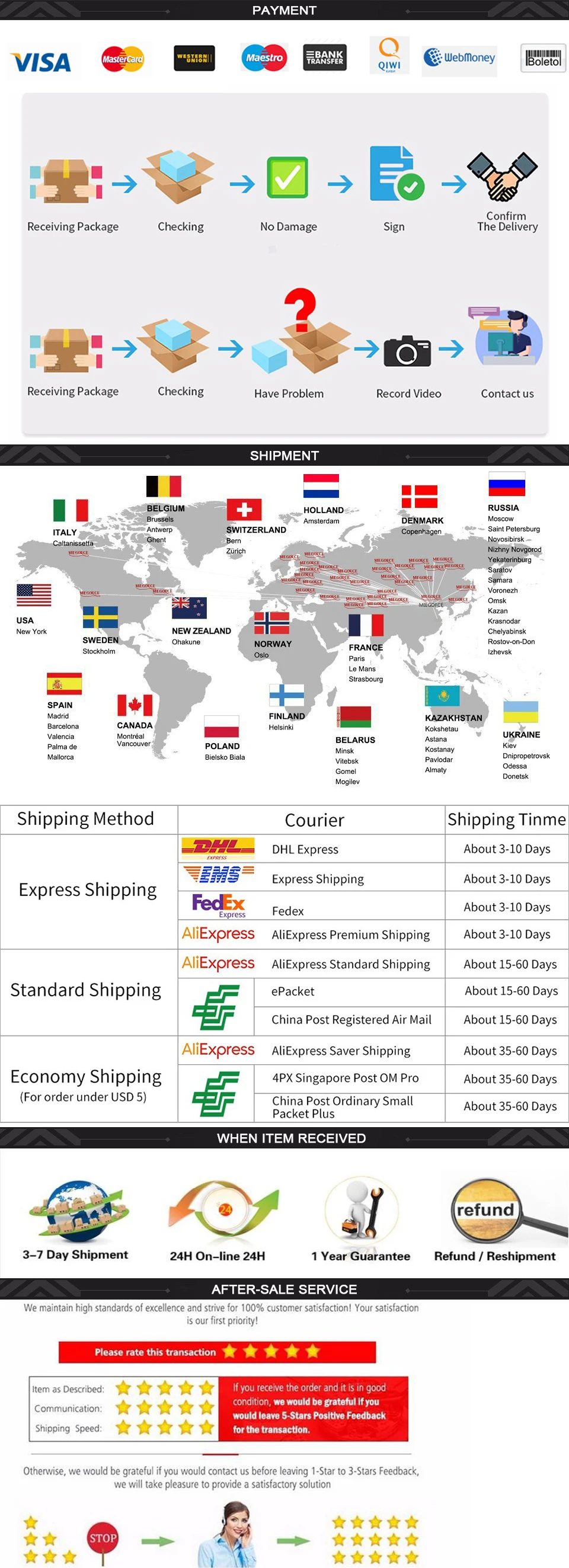 Во-вторых: о логистической проблеме, если вы не можете получить ваши любимые товары из-за логистической или таможенной проблемы, пожалуйста, сначала свяжитесь с нами, мы можем вернуть или повторно отправить вместо того, чтобы давать отрицательные отзывы, пожалуйста, Потому что нам действительно нужно удовлетворение клиента, и мы сделаем все возможное, чтобы решить вашу проблему. Спасибо за сотрудничество!