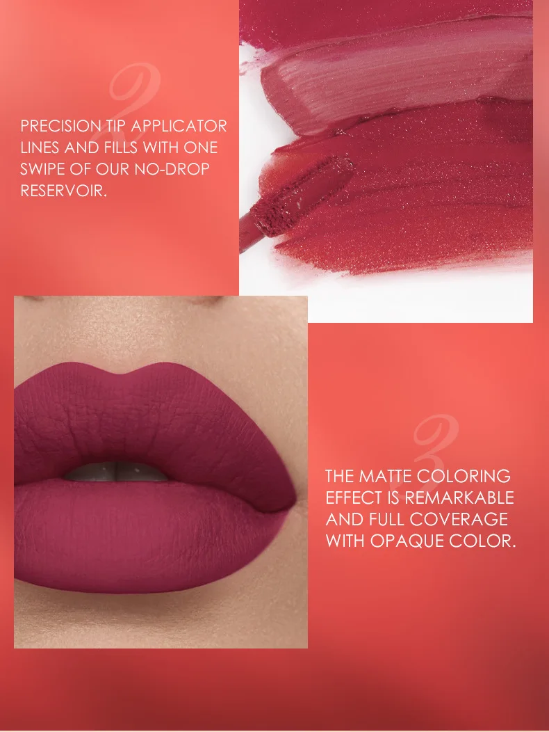 Помада с инновационной формулой, которая скользит по губам, как блеск, но высыхает до ультраматового, непрозрачного внешнего вида.