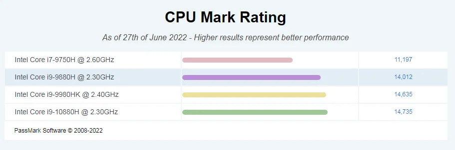 Core i9-9980HK | 8 cores, 16 threads | 16M | 2.40 GHz | 5.00 GHz | Intel UHD Graphics 630 350MHz-1.25GHz |