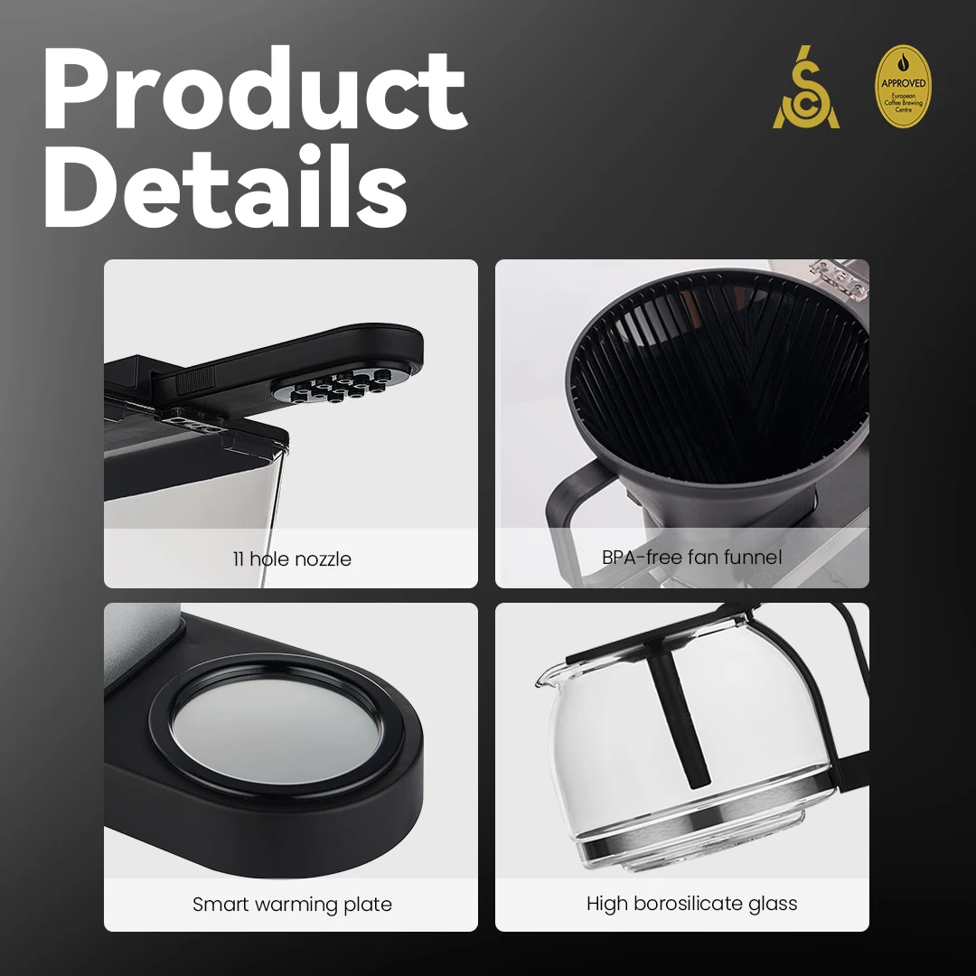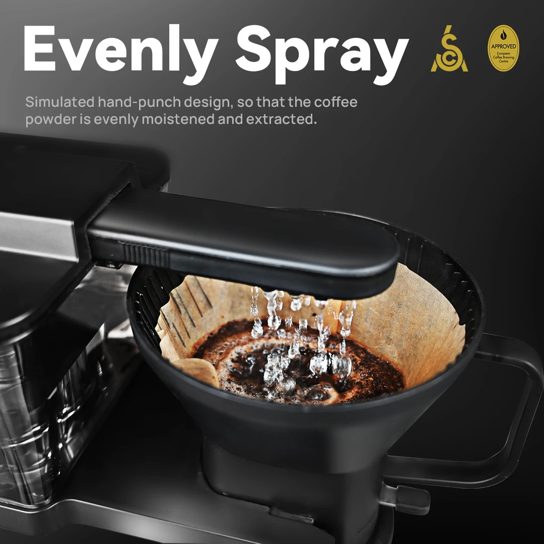 Кофеварка Используется уникальная 11 отверстий компоновка зон устьевого оборудования для имитации ручной работы для извлечения и многое другое точно контролировать с низким уровнем скорости падения воды для того, чтобы обеспечить даже увлажнения вместимость ящика для кофейного порошка. Точный фильтрующий для того, чтобы избежать чрезмерной экстракции горячую воду от центра. Полный паром, чтобы освободить полной ароматом кофе, так что вы можете наслаждаться SCA золото чашка кофе стандарта в любое время.