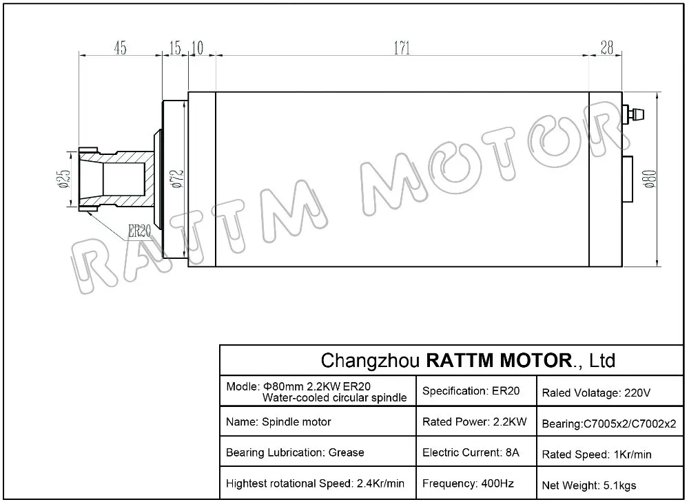 1x2,2 кВт шпиндель с водяным охлаждением (ER20,400 Гц, 24000 об/мин, 4 подшипника) (ЕС поставляет 220 В Тип, США поставляют 110 в тип)