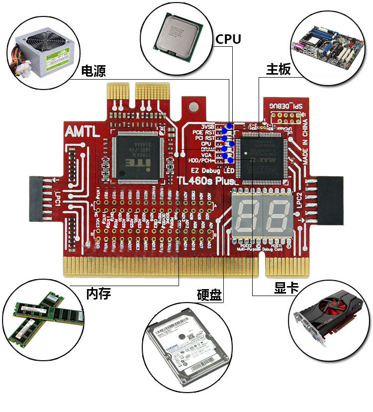 Простой светодиодный светильник для обнаружения ошибок1. Режим ожидания 3VSB-это индикатор питания.2. Цифровая трубка для дистилляции Десятичная точка-это дисплей с тактовым сигналом3. PCIE RST/PCI RST-это основная плата для сброса сигнала.4. Индикатор отладки ЦП указывает на сбой модуля ЦП5. Индикатор отладки DRAM указывает на сбой модуля памяти.6. Сигнальная лампа VGA указывает на неисправность модуля карты дисплея7. HDD/PCH = универсальная лампа для отладки универсальный индикатор жесткого диска/Nanqiao/Beiqiao/USB/SATA и другие модули неисправны