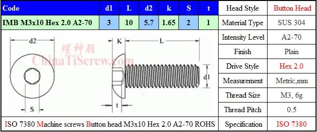 ISO 7380 винты для головки кнопки M3x10 Hex 2,0 драйвер SUS 304