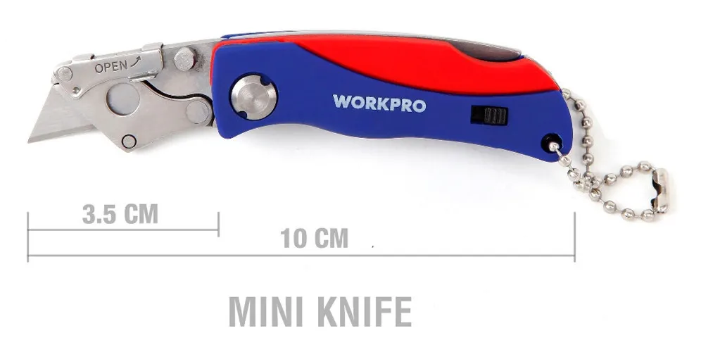 * Универсальный мини-нож WORKPRO Utility Mini Quick Change Lock Back оснащен функцией открывания одной рукой для удобства использования, когда вы режете препятствия, такие как бумага, картон и многое другое. * Он может похвастаться быстросменным механизмом для быстрой и легкой замены лезвий. Данный инструмент имеет 6 Универсальный мини-нож лезвий (5 хранятся в рукоятке и бонус 6-й в держателе лезвий). * Этот нож имеет легкую рукоятку ABS для максимального Хвата и комфорта, и включает в себя брелок для вашего удобства! * Вы можете с легкостью разрезать шпагат, коробки и многое другое.