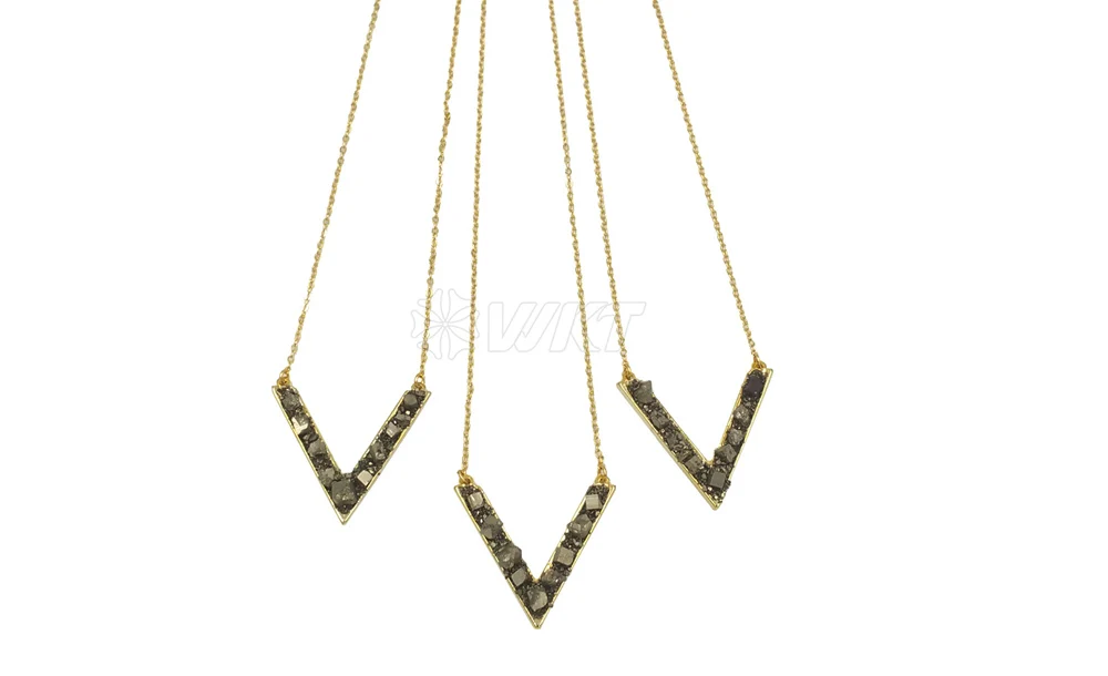 WT-N714Amazing design Letter V Pendant gold necklace Jewelry natural pyrite stone letter V charm pendant 18"chain necklace gift