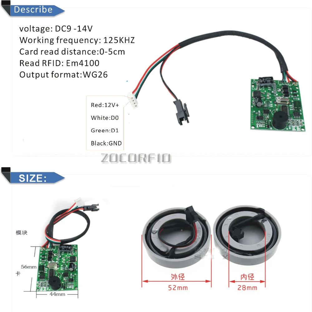 Напряжение: 9 -14 В постоянного тока Рабочая частота: 125 кГц Расстояние считывания карты: 0-5 см Формат вывода: WG26