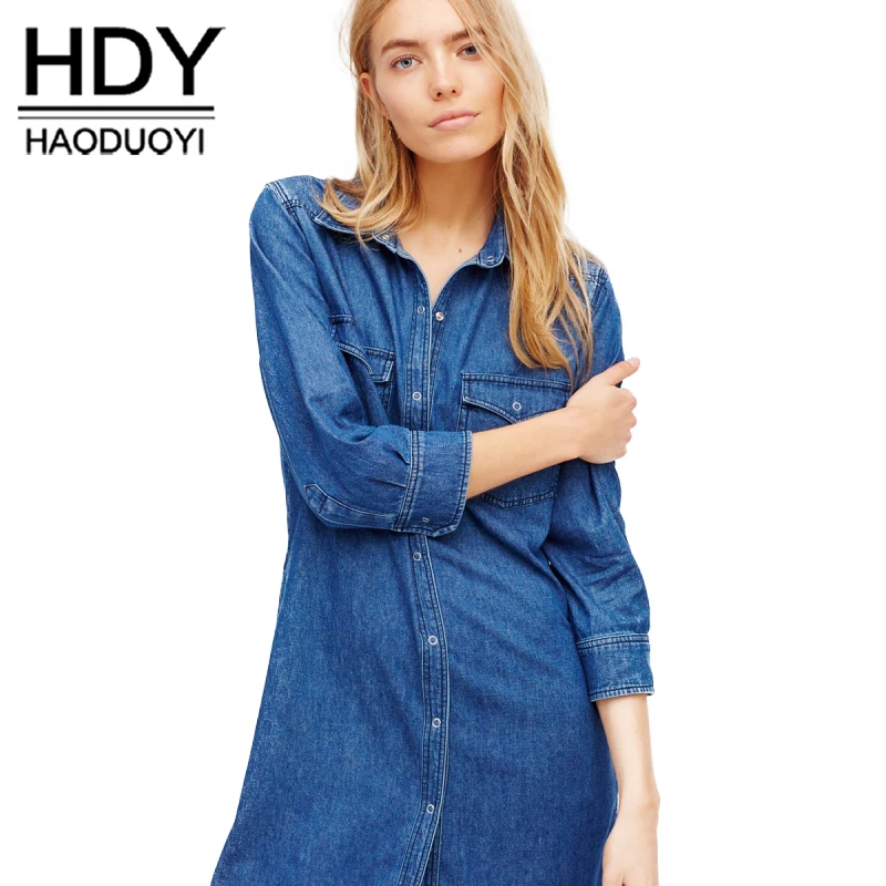 HDY Haoduoyi модное джинсовое платье миди женское прямое платье с рукавом 3/4 короткое Стильное однотонное синее Повседневное платье на одной пуговице |