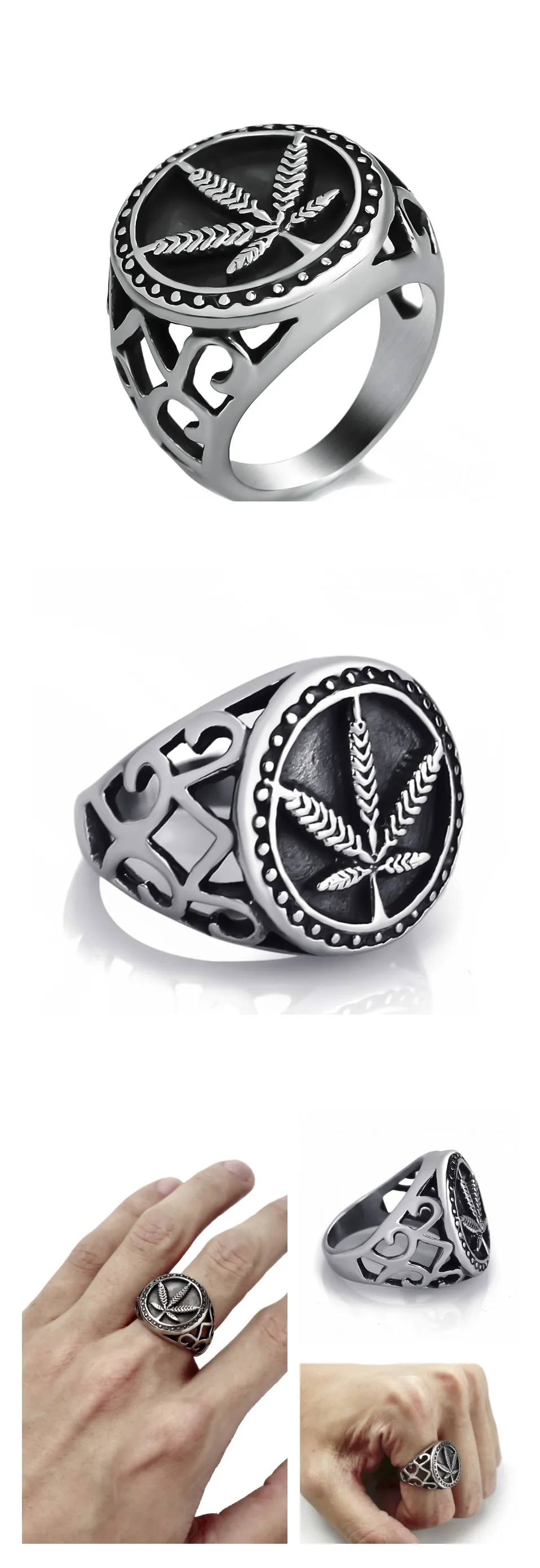 Mens Boys Stainless Steel Ring Weed Marijuana Cannabis Leaf Symbol Fashion Jewelry Size 8-13