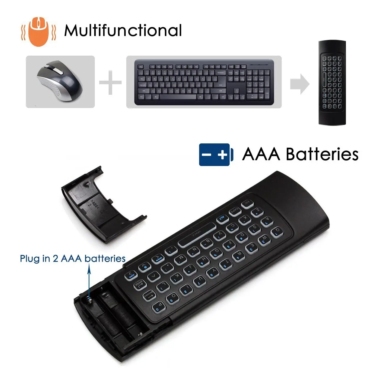 Многофункциональная, беспроводная мини-клавиатура и ИК-пульт дистанционного управления и Fly Mouse Combo, с usb-интерфейсным приемником Совместимость с Google Android Smart TV/Box, IPTV, сетевая приставка, мини ПК, HTPC, Windows ,MAC OS,PS3, проектор и т. Д. Используйте его, чтобы легко вводить текст, просматривать Интернет и играть в игры с помощью унифицированной клавиатуры и пульта ДУ. Вам никогда не придется покидать диван. Подключи и работай, расстояние передачи до 10 метров. 3-гироскоп + 3-Gsensor, удобно работать в горизонтальном и вертикальном режиме для игр и ввода текста ИК-обучение: он учится до 5 клавиш на вашем ТВ ИК-пульте
