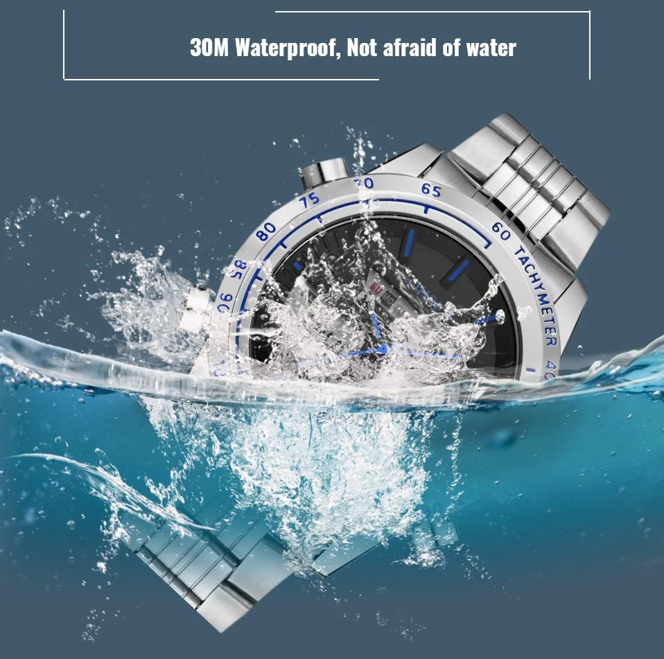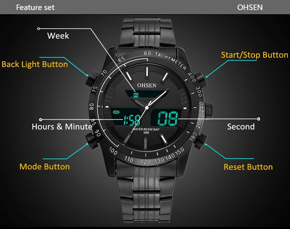 1. Двойной дисплей времени 2. Цифровой дисплей: час, минута, секунда, pm, месяц, дата, день 3. Формат 12/24 часов 4. Будильник и функция ежечасного звонка 5. Специальный дизайн с хронографом (секундомером) с шагом 0,01 секунды 6. Дополнительный светодиодный светильник для отображения времени в темноте 7. Глубина водонепроницаемости до 30 м (не нажимайте кнопки в воде)