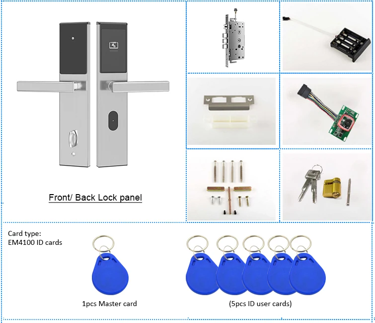 Each lock is packed with 1pcs Mater card and 3pcs blue keyfob user cards.