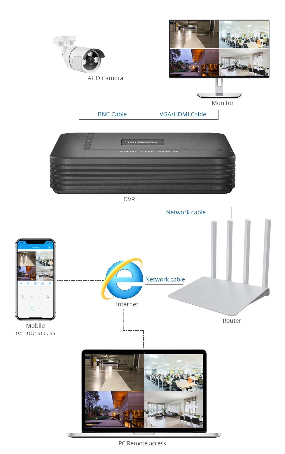 Поддерживается аудио интерфейс; Кабели BNC подключают AHD камеры и AHD DVR; Имеет 2 USB, один-для мыши, а другой-для занятий чем-то вроде резервного копирования или передачи данных; интерфейс RJ45 подключает Ethernet для просмотра видео через приложение.