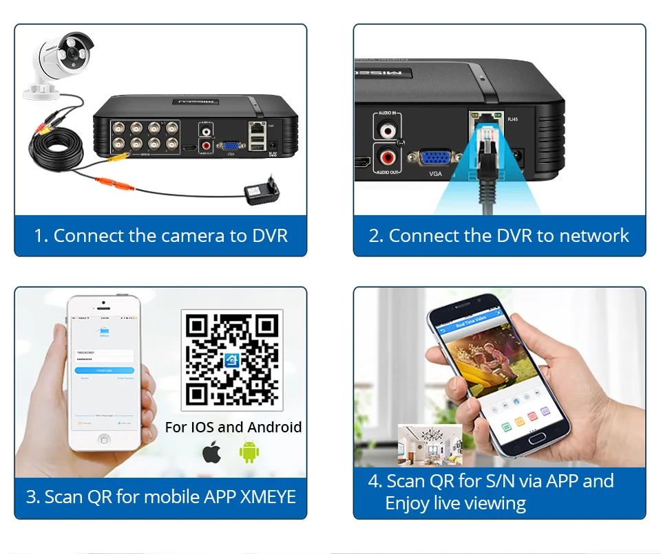 Установите мобильное приложение через сканирование QR-кода или загрузите из магазина приложений. Затем вы сможете удаленно получить доступ к системе безопасности в любое время в любом месте Удаленный просмотр камеры через: бесплатное приложение XMeye на вашем мобильном устройстве, бесплатный клиент CMS на вашем компьютере, браузеры IE.