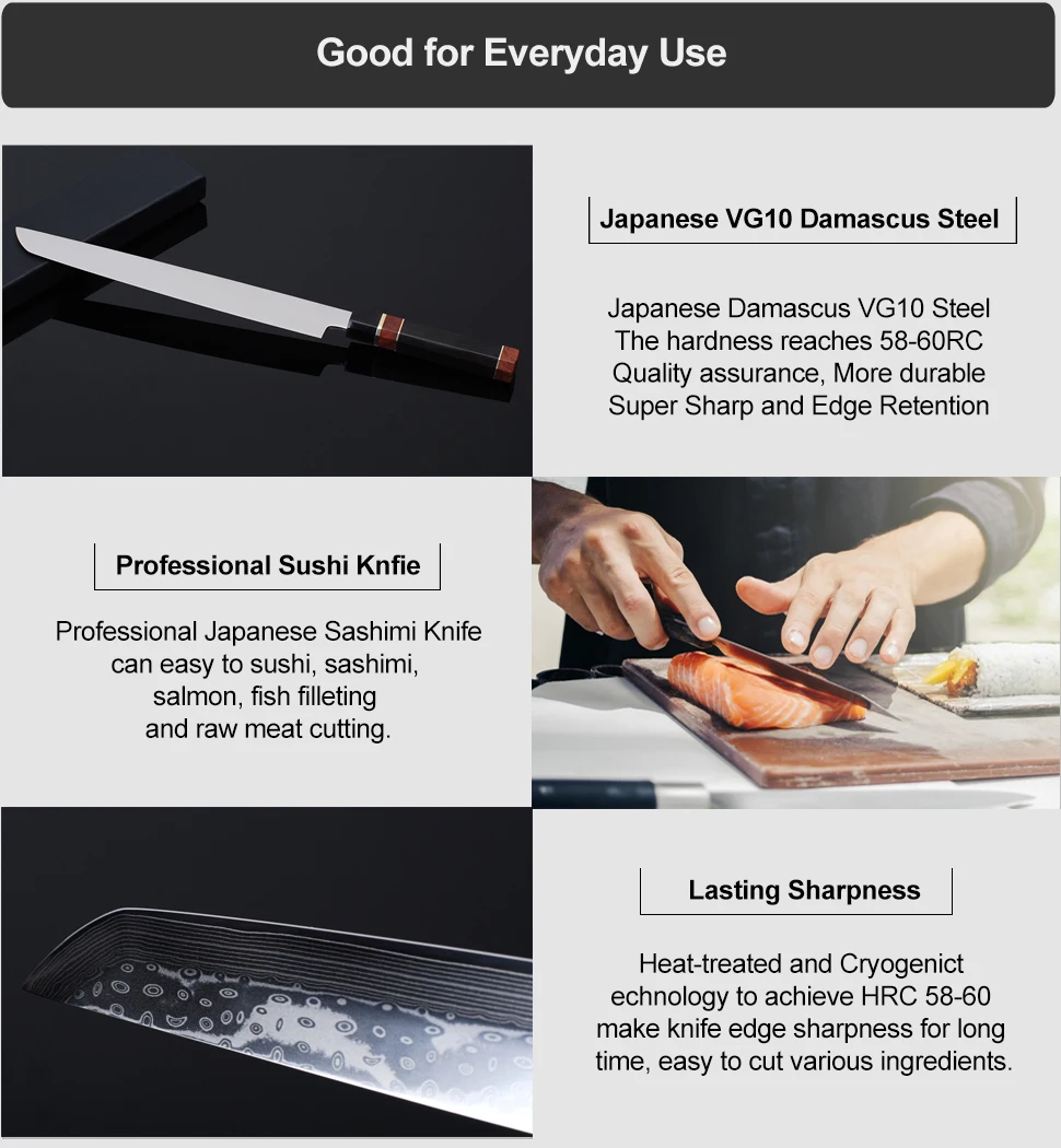-Идеально подходит для суши/Сашими/рыб/мяса/овощей/фруктов и т. д. без отрыва и сжигания, только безжалостная эффективность.