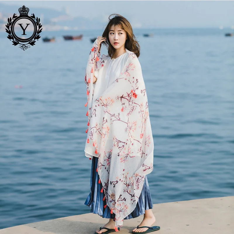 Женские шарфы из 2017 хлопка с принтом с кисточками Большие женские платки и накидки-пончо Парео Пляжная Обложка для ИБП Повседневный платок