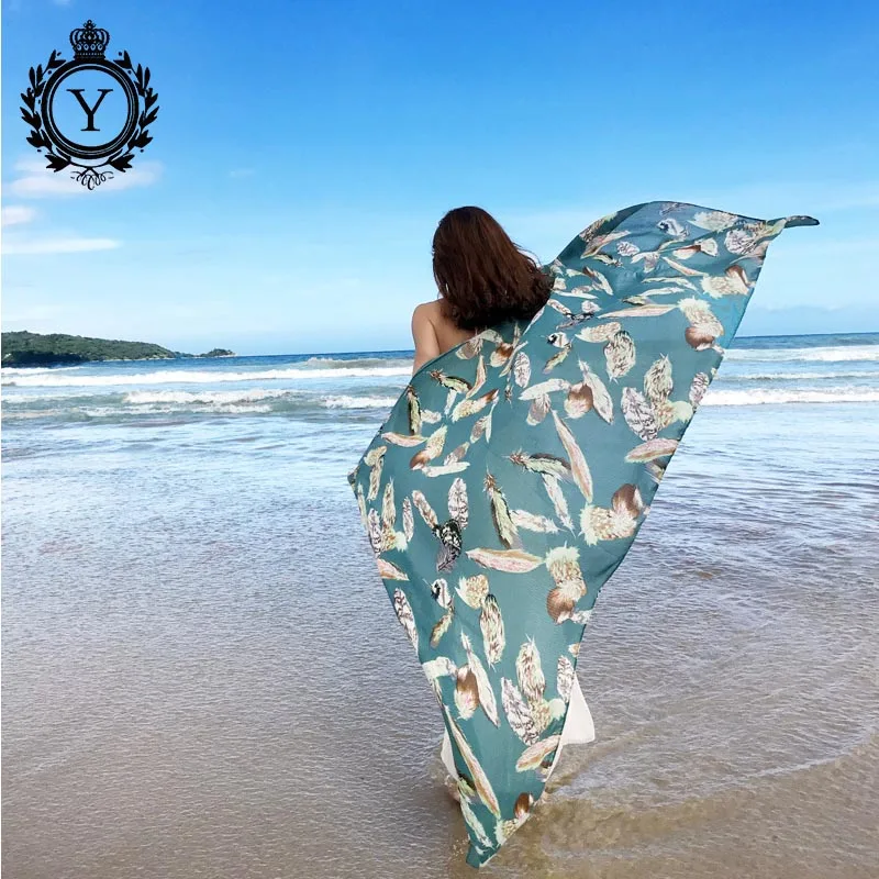 Кутуди 2017 перо принт шарф шали Женщины Лето парео Пляж пашмины Обертывания накидки искусственный шелк хлопок шарфы Леди роскошь