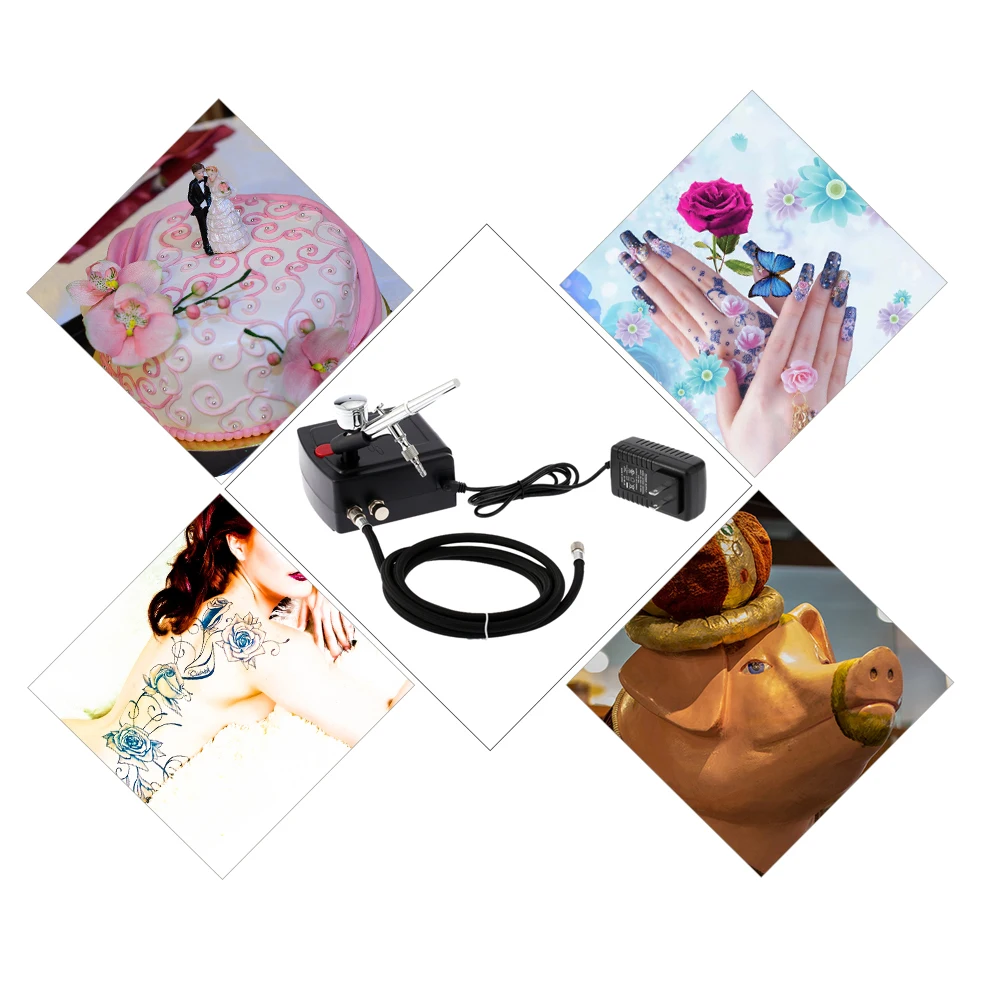 Включает портативный воздушный компрессор, воздушный шланг, двойного действия гравитационный питательный Аэрограф, мини воздушный фильтр, держатель, гаечный ключ сопла и капельница для глаз.