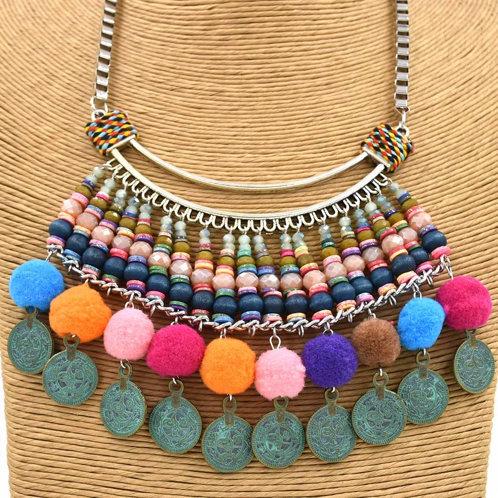 Новинка, ручная работа, бисерное богемное этническое ожерелье, ожерелье, винтажные монеты бохо, цветные помпонные подвески, колье, чокеры, ожерелье