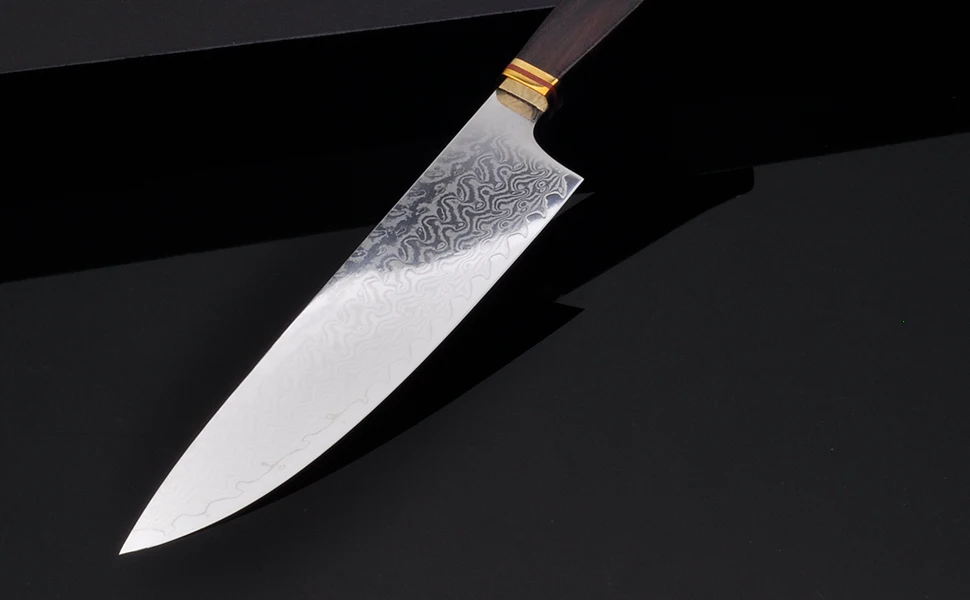 ● Прецизионное Кованое лезвие с высоким содержанием углерода из японской дамасской стали VG10 при 58-60 HRC, высокое содержание хрома (Cr) добавляется в сталь для стойкости к пятнам.