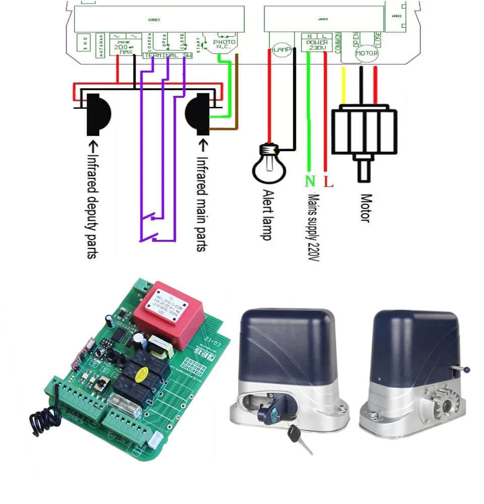 Это оборудование является одним из автоматических открывателей ворот, запущенных нашей компанией, с новым дизайном и интегрированной системой управления. Наш новый Открыватель раздвижных ворот имеет множество функций, таких как: низкий уровень шума, легкий вес, мощный пусковой момент, стабильность, надежность и Компактный и стильный. Двигатель будет работать в течение короткого периода времени с использованием низкого напряжения. Плата управления имеет защиту от перегрузки. Когда происходит сбой питания, привод двигателя может быть разделен с помощью сцепления, С помощью указанного ключа пользователь имеет возможность отсоединить сцепление, что позволяет открыть или закрыть ворота вручную. При использовании дополнительных инфракрасных фотоэлементов ворота автоматически останавливаются и повторно открываются, если обнаруживается препятствие.