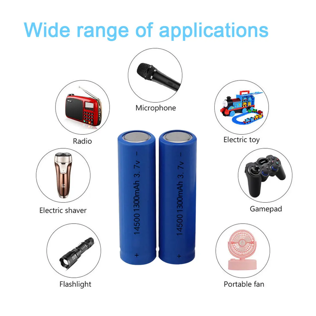 С 1300 мАч емкость, они работают отлично подходит для ваших потребностей, таких как флэш-светильник, налобный фонарь, фары для автомобилей Светодиодный Ночной светильник и электрической зубной щетки и т. д. Правильное 14500 батарей, вероятно, прослужит дольше для вашего оборудования, работающего от батарей. И напряжение заряда 4,2 V, это не займет много времени, чтобы начать зарядку.