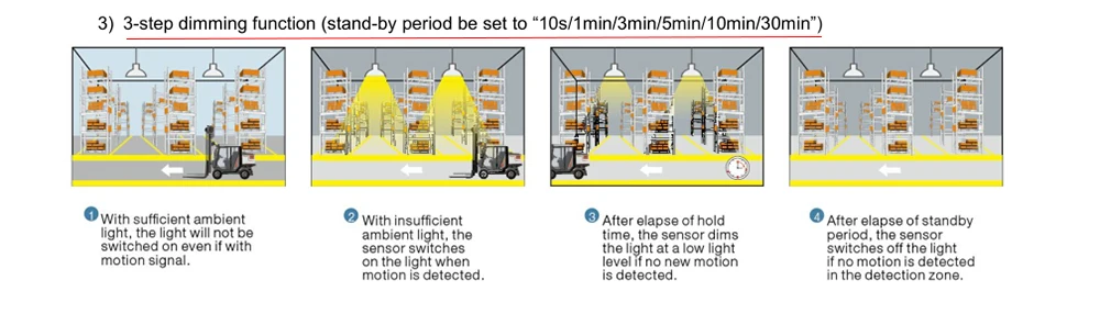 Wide detection area, range up to 16m in diameter and mounting height 15M Max. suitable for warehouse use.