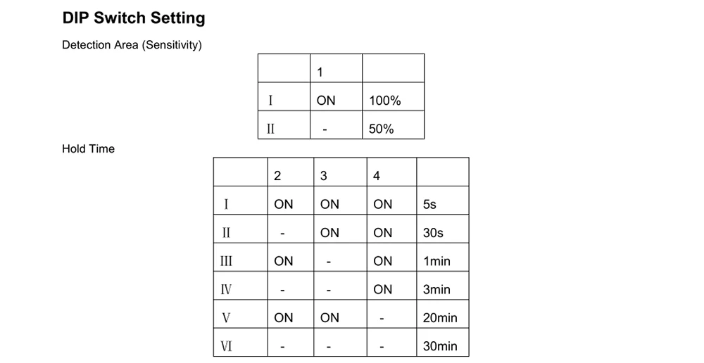 Detection area, time delay and daylight threshold can be precisely set via DIP switch