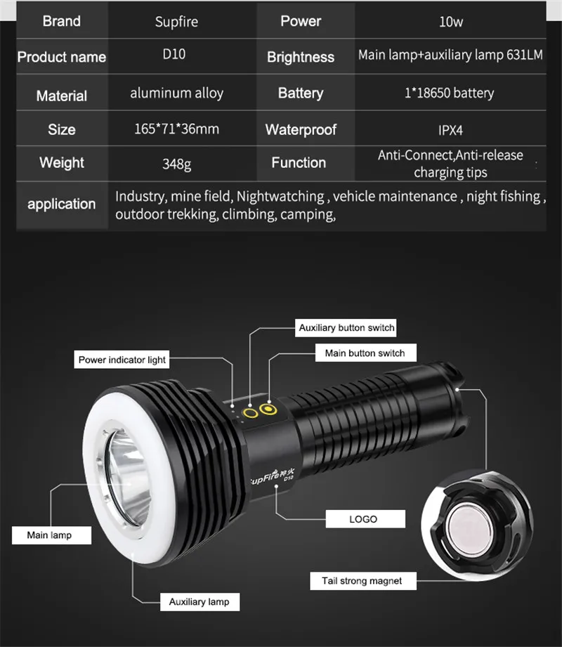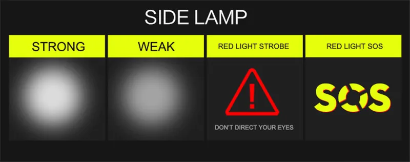 Источник света: импортированный США CREE XML2 (U2) светодиодный Яркость: 2500 лм Мощность: 10 Вт Материал: Авиационный Алюминий 6061-T6 Размер: 165*71*36 мм Вес нетто: 348 г Режим: Основная лампа: 3 режима (Высокий> Средний> слабый) Боковая лампа: 4 режима (Высокий> слабый> Красный светильник стробоскоп> Красный светильник SOS)