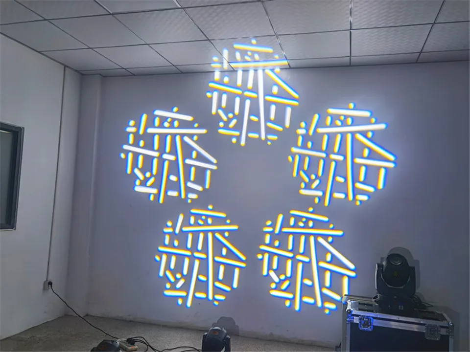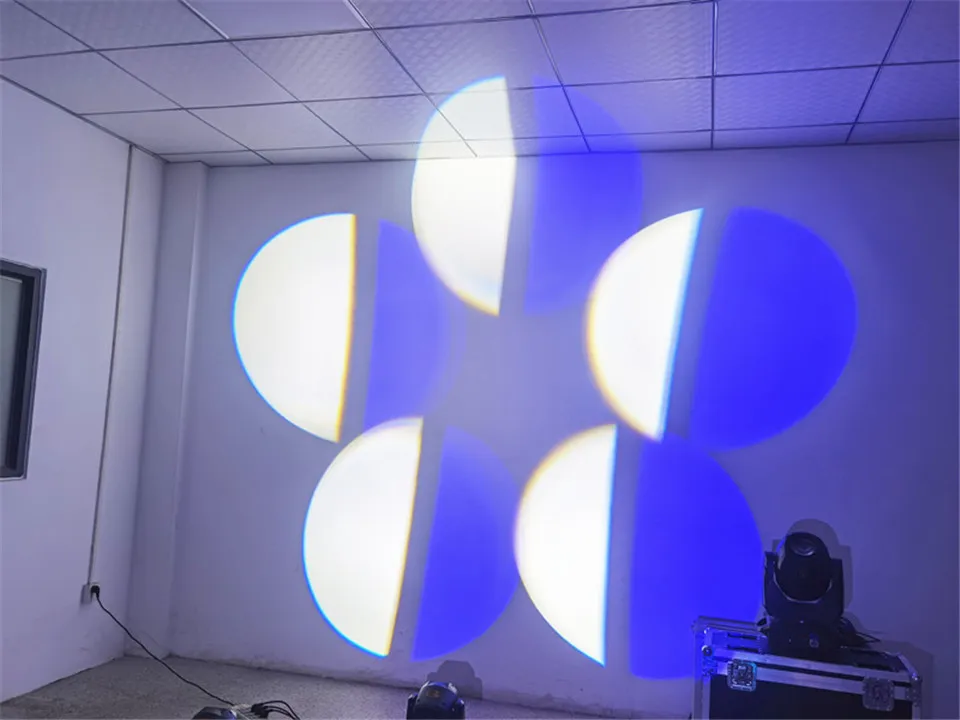 Gobo statici: 8 gobos metallici + bianco, versato colori, effetto arcobaleno.