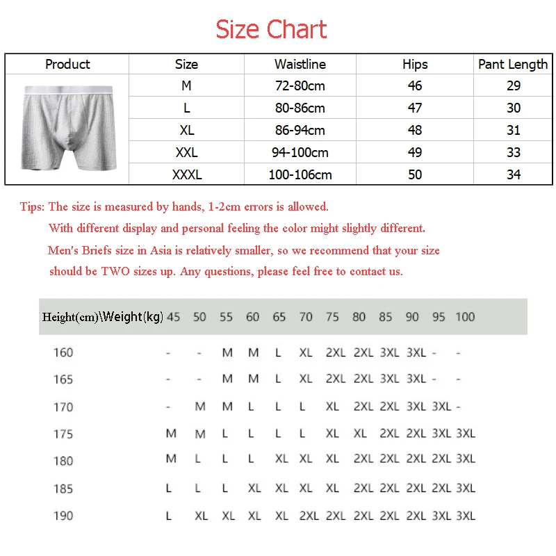 Примечание: 1. Размеры мужских трусов в Азии относительно меньше, поэтому мы рекомендуем Вам заказывать на два размера больше. 2. Размеры измеряются вручную, допускается погрешность в 1-2 см. 3. С различными экранами, дисплеями и личными ощущениями, цвет может немного отличаться.