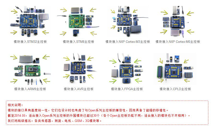 Интерфейс модуля очень унифицирован, и они также рассматривают Совместимость с открытой серии Главного управления платы в дизайне, таким образом иметь супер переносимость. До 2014.05 существует более 30 периферийных модулей, подходящих для доступа к главной контрольной плате серии open (Различные открытые основные контрольные платы имеют различные функции, а Различные модули подходят для доступа). Мы удалимся в правопреемстве: различные датчики, диапазон, мотор, gsm, 3G Модуль и тд.