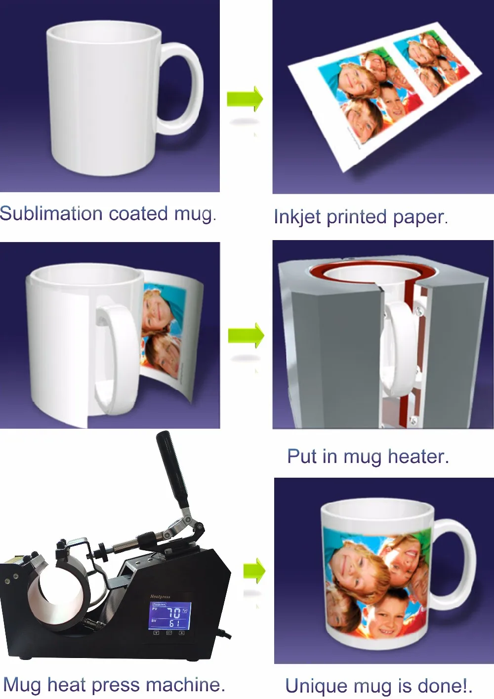 Применение продуктаСколько больше личного вы можете получить, чем кружка с индивидуальным дизайном кофе (горячий шоколад)? Оцените своих тренеров, волонтеров, сотрудников, родственников, друзей или себя с красивой памятью. Чтобы действительно показать свою благодарность, позвольте нам предоставить вам кружки с кофе (горячим шоколадом) с вашей редакцией и специально подобранным фото, логотип компании или команды, уникальный дизайн, или даже фактические подписи сублимируются в полном цвете. Все эти удивительные работы могут быть выполнены этой сублимационной машиной для прессования кружек.