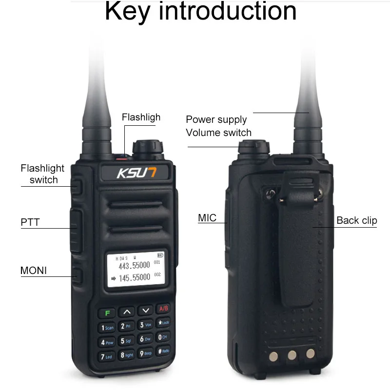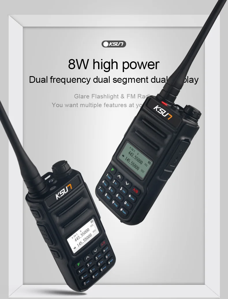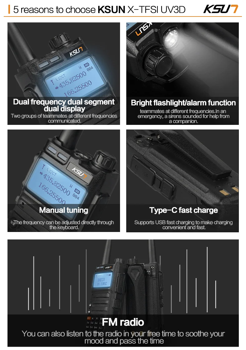 KSUNUV3D иди и болтай Walkie Talkie “иди и мощные радиостанции ①UV двойной частоты ②FM радио ③Flashlight ④ отделение для удостоверения личности-Тип Type-C для быстрой зарядки ⑤Alarm функция ⑥ голосовые активированного выбросов ⑦Channel хранения ⑧Keyboard замок