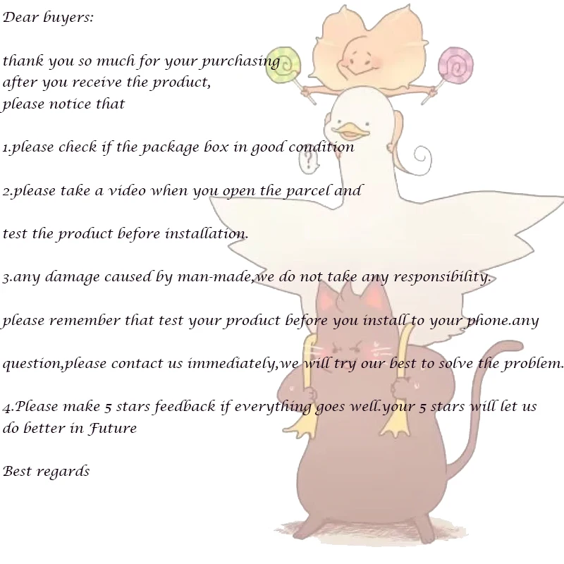 | Преимущества: | 1. Десять лет золотого поставщика в Китае. Наш клиент распространяется по всему миру. Высокое качество и лучшая репутация в этой отрасли. 2. Широкий ассортимент запчастей для мобильных телефонов, все, что вам нужно, мы можем предоставить вам все, что мы получили или нашли для вас. Поможет вам сэкономить ваши деньги и время. 3. Профессиональная команда контроля качества для контроля качества деталей, чтобы убедиться, что наша продукция всегда высокого качества. Ведите бизнес с нами, чтобы ваши деньги покупали правильные товары. 4. Лучшие продажи и продукты группы, 24 часа в сутки онлайн убедитесь, что вы можете найти нас, когда вам нужно. Экономьте время, чтобы расслабиться и с семьей. 5. Условия оплаты с диверсификацией. Мы принимаем T/T, western union, moneygram PayPal и так далее. 6. Все наши продукты получаютОдин годГарантия. 7. Мы можем отправить вам товары DHL/EMS и т. д. 8. Мы организуем промо-акции часто. Добро пожаловать к нам. |