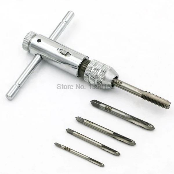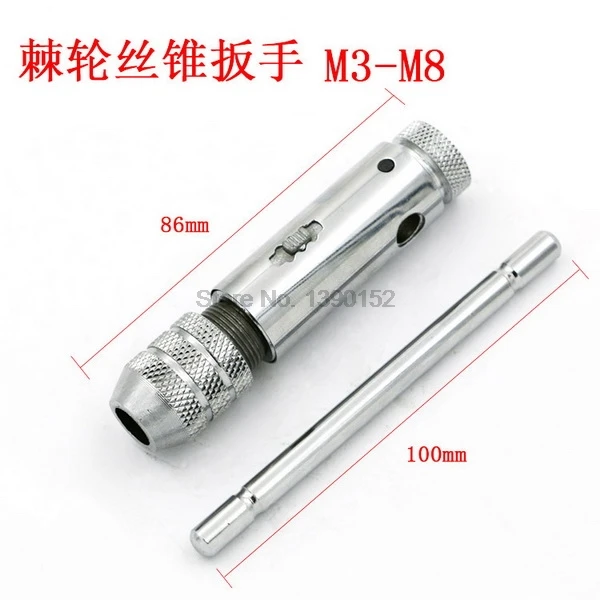 Material: Ratchet Tap Wrench:Alloy steel (surface treatment: electroplating) Screw Thread Taps:Ball-bearing steel Color: Silver (shown as the pictures) Length of wrench: 85mm/3.3inch, 100mm/3.94inch (shown as the pictures) Size of screw thread taps (Standard): M3*0.5, M4*0.7, M5*0.8, M6*1.0, M8*1.25