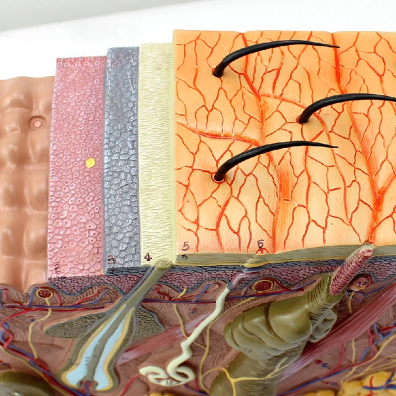 70 раз модель анатомического увеличения кожи, модель имеет подкожную клетчатку, соединенную с глубокой тканью, и показывает структуры, такие как эпидермис, ДЕРМАЛЬНАЯ ткань, подкожные ткани и добавки кожи (включая волоски, сальных желез, потовых желез и нервных окончаний). Это редкая модель для обучения и демонстрации дерматологии.