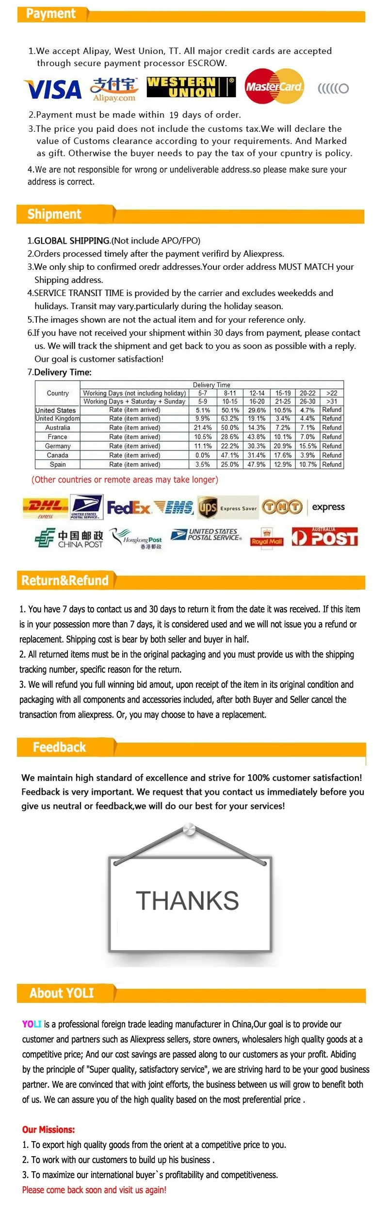 Заказ будет отправлен в течение 24 часов. В дополнение к Китаю, российские клиенты могут выбрать доставку локально по России, что быстрее! Российская Федерация может быть отправлена из Москвы компанией IML.