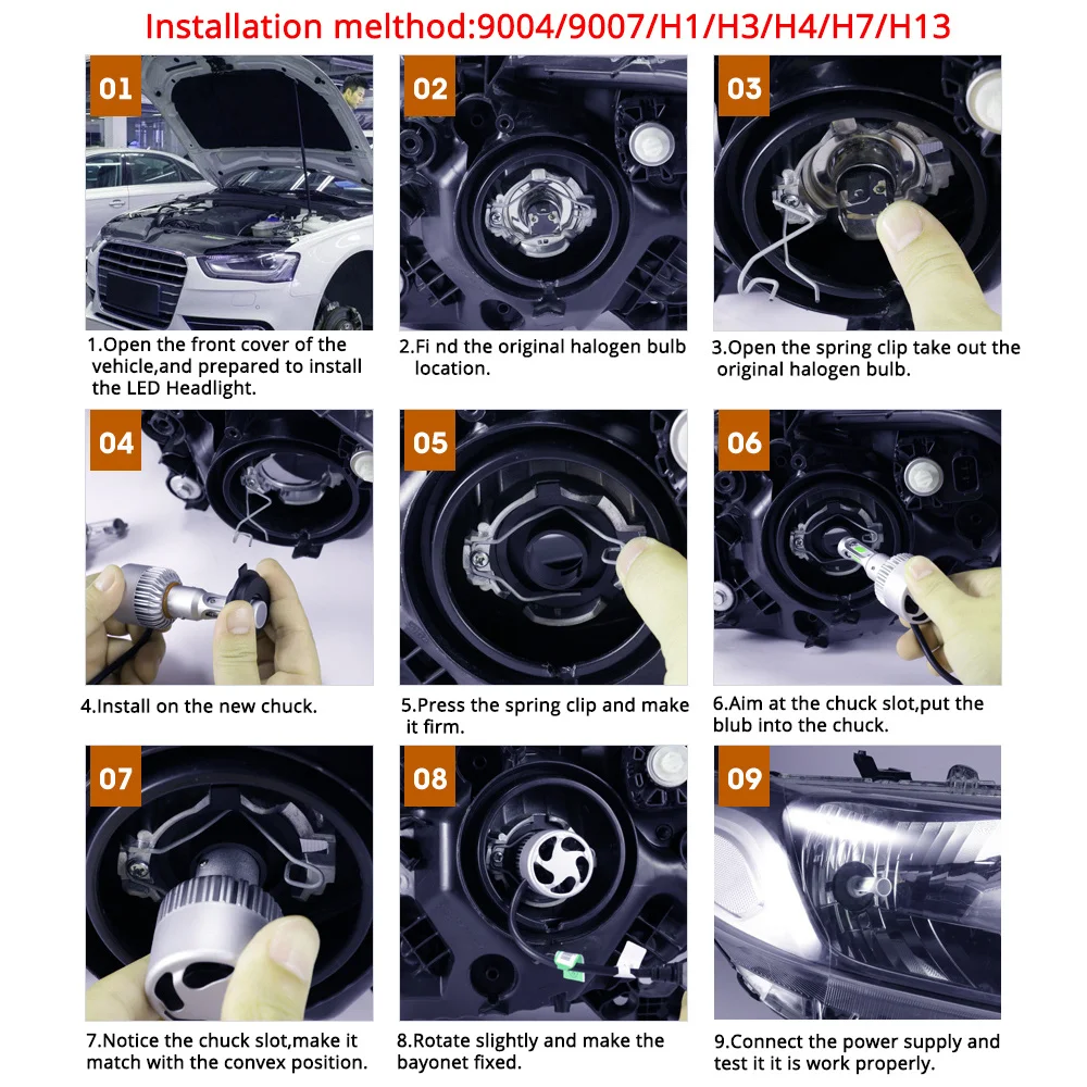 H4/H13/9004/9007 are hi-lo beam,3 luminous faces(270/360 degree),3pcs Bridgelux COB chips